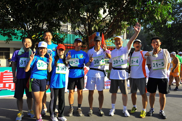 11月5日,秋陽(yáng)燦爛,大家早已躍躍欲試,隊(duì)中負(fù)責(zé)后勤的我,早在比賽前夕就廣發(fā)注意帖:速干短褲、帽子、腰包、水杯、小方巾、鞋子等物品需必備;作為隊(duì)伍領(lǐng)頭雁的齊總則早已咨詢專業(yè)選手,提倡大家結(jié)合自己體力準(zhǔn)備能量棒、巧克力等緊急能量品;隊(duì)長(zhǎng)鄧總在了解路線和路況后,制定了“穩(wěn)重取勝”的戰(zhàn)略,采取了“準(zhǔn)備活動(dòng)做充足,先慢后快求適應(yīng),不因外因亂陣腳,敵疲我追求成績(jī)”的具體戰(zhàn)術(shù);隊(duì)伍中的另一名隊(duì)員則帶來(lái)了他專業(yè)的GPS定位手表,分時(shí)段匯報(bào)所走路程、當(dāng)前速度適當(dāng)與否,并提前告知提速準(zhǔn)備;我們的女隊(duì)友亞梅,則一路保持微笑,緊跟隊(duì)伍,偶爾爆出的一些冷笑話,讓緊張趕路的我們倍感清爽。
