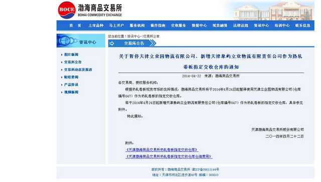 近日,天津象嶼立業(yè)物流有限責(zé)任公司與渤海商品交易所簽訂協(xié)議:天津象嶼立業(yè)物流有限責(zé)任公司成為渤海商品交易所于天津的指定交收倉(cāng)庫(kù)。2014年4月23日,渤海商品交易所正式發(fā)布了市場(chǎng)公告。