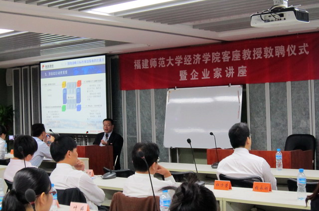 9月24日,象嶼股份總經理鄧啟東應邀來到福建師范大學倉山校區(qū)參加“福建師范大學經濟學院客座教授敦聘儀式暨企業(yè)家講座”活動。敦聘儀式上,福建師范大學MBA教育中心常務副主任章竟代表福師大致歡迎辭,經濟學院李建建院長為鄧啟東總經理佩戴?;詹㈩C發(fā)了聘書。